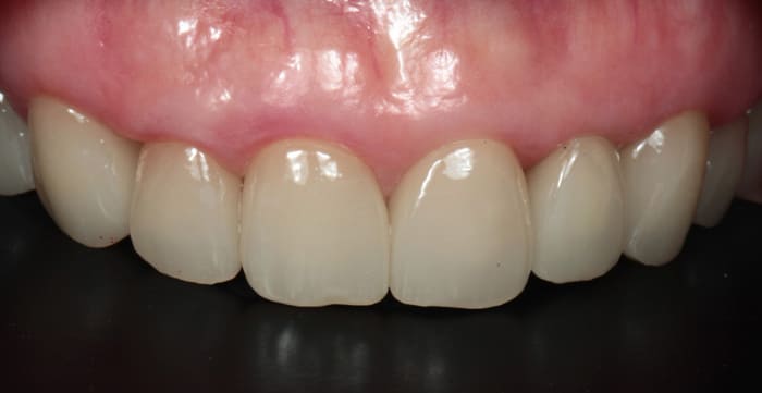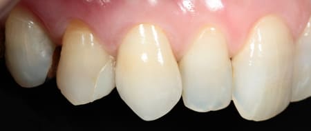 写真は新製時のものだが、装着後は周囲の天然歯と見分けがつかないくらい自然感のある歯が再現されているのがわかる。