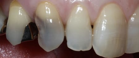 - 表側から見てもかなり目立つ状態の虫歯になっていた。レントゲン審査及び虫歯除去位の結果、神経は抜かずに歯の土台になる部分を修復しクラウンを被せて審美的な結果が得られた。