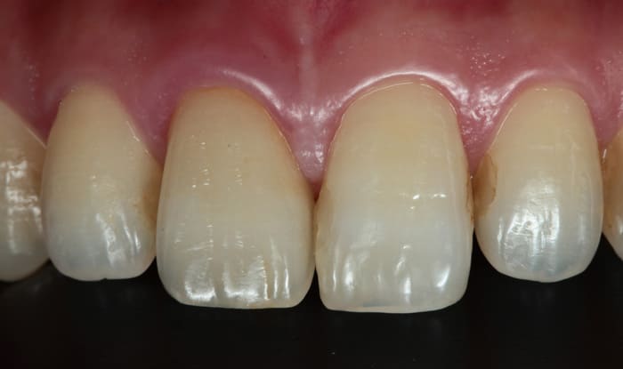 周囲の天然歯と比較しても自然な仕上がりになっている。土台の歯質が少ないため、残りの部分でいかに維持力の高い形態を付与するかが、治療を成功させる上で重要になってくる。