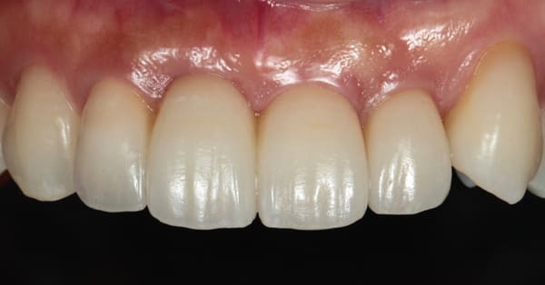 この歯の再根管治療を行なった後に4前歯を仮歯に替えてそれを使用して頂きながら、歯の形態や発音、口唇や顔貌とのバランスを患者さんの希望を踏まえた上で調整し、最終的な左右のクラウンの幅を均等にするために、右上2番はラミネートベニア、右上1番から左上2番はジルコニアクラウンを装着して審美的な改善を行なった。