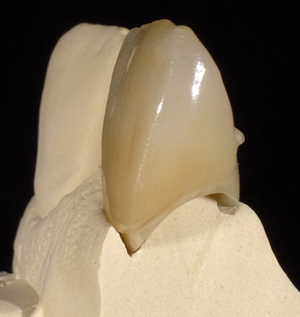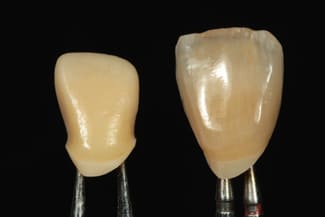 出来上がった内側のジルコニアフレームの上に、セラミックを焼き付けて色や形態、表面性状を作っていきます。